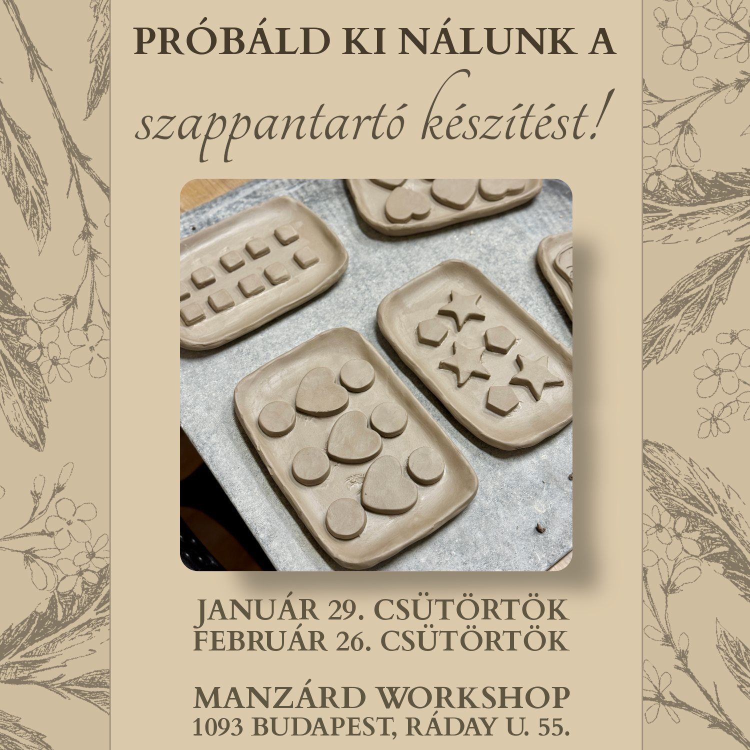 🧼 Január 29-én (csütörtök) egy igazán laza és kreatív agyagozós foglalkozás vár rád – egy olyan alkotónap, ahol nemcsak kikapcsolódsz, hanem elkészíthetsz egy gyönyörű, teljesen egyedi, saját készítésű szappantartót. 🛀🫧✨